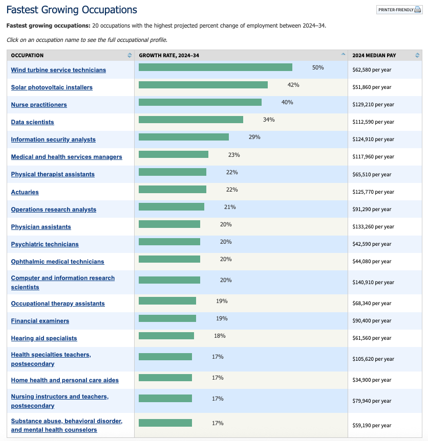Some sectors will see more growth than others. Healthcare, renewable energy and technology, in particular, will show healthy growth. The U.S. Bureau of Labor Statistics recently published the following:
